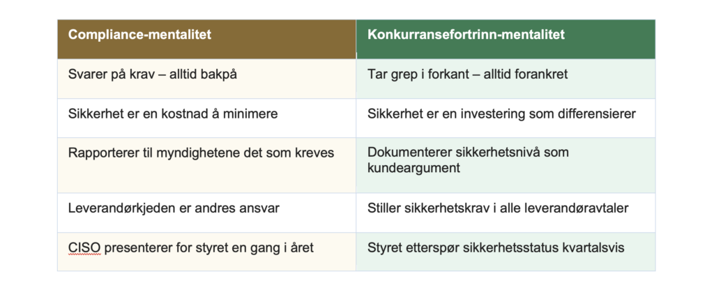 Virksomheter som kun reagerer på regulatoriske krav, vil alltid ligge etter trusselbildet. De mest fremoverlente virksomhetene bruker sikkerhet som en strategisk ressurs.
